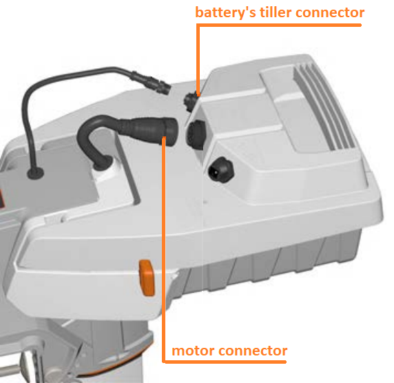 The autopilot can be connected to either the battery’s tiller connector or to the motor connector. If the torqeedo’s built-in battery will be used then the autopilot should be connected to the tiller connector. If instead a separate battery will be used then the autopilot should be connected to the motor connector (and the built-in battery can be removed)