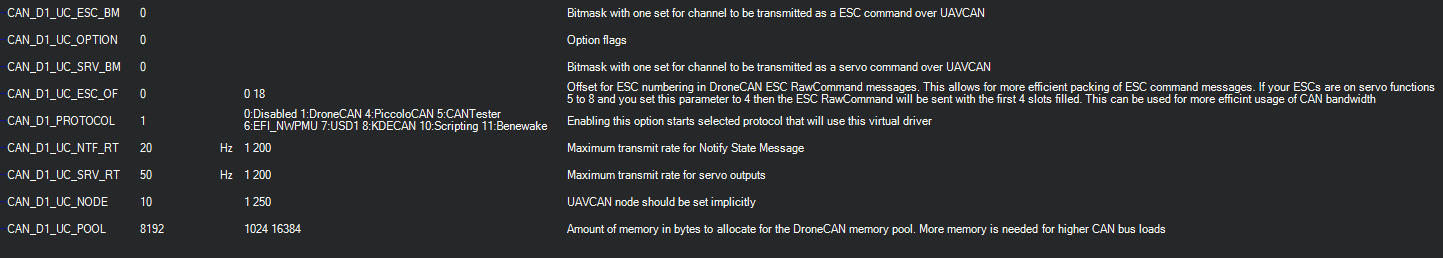 There are three parameters that determine which autopilot servo/motor channels are sent to the CAN ESC and/or Servos: For the examples below, the values are shown for CAN driver #1.