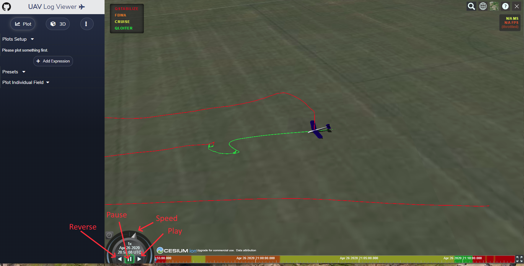 which is the 3D flight viewer. You can replay the flight in 3D by pressing the “play” button, or “pause”, “reverse”, or change playback “speed”. Various map tools/options are in the upper right corner.