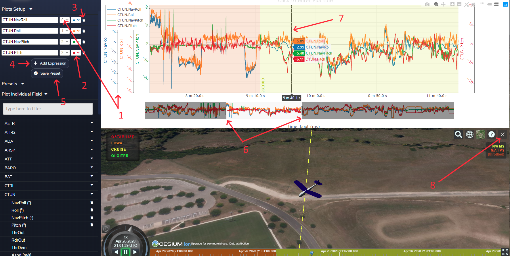 4. You can even create and plot expressions that use the fields by “Add Expression” button. See ` Graph Expressions for MavExplorer <https://ardupilot.org/dev/docs/using-mavexplorer-for-log-analysis.html#graph-expressions>`__ for examples of using expressions in a plot analysis.