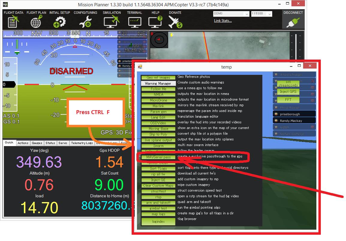 On the Flight Data screen press Ctrl-F and then select “MAVSerial pass”