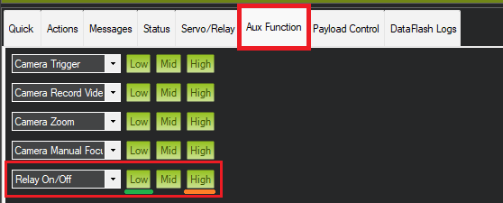 • The camera can be powered off/on using an auxiliary switch set to “Relay 1 On/Off” or Mission Planner’s Aux Function screen can be used. Pulling the relay high will turn the camera off, low will turn it back on.