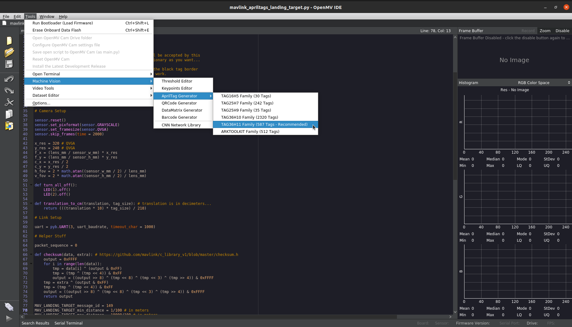 Go to Tools -> Machine Vision -> AprilTag generator -> TAG36H11 Family (587 Tags - Recommended). This will open a small dialog box.