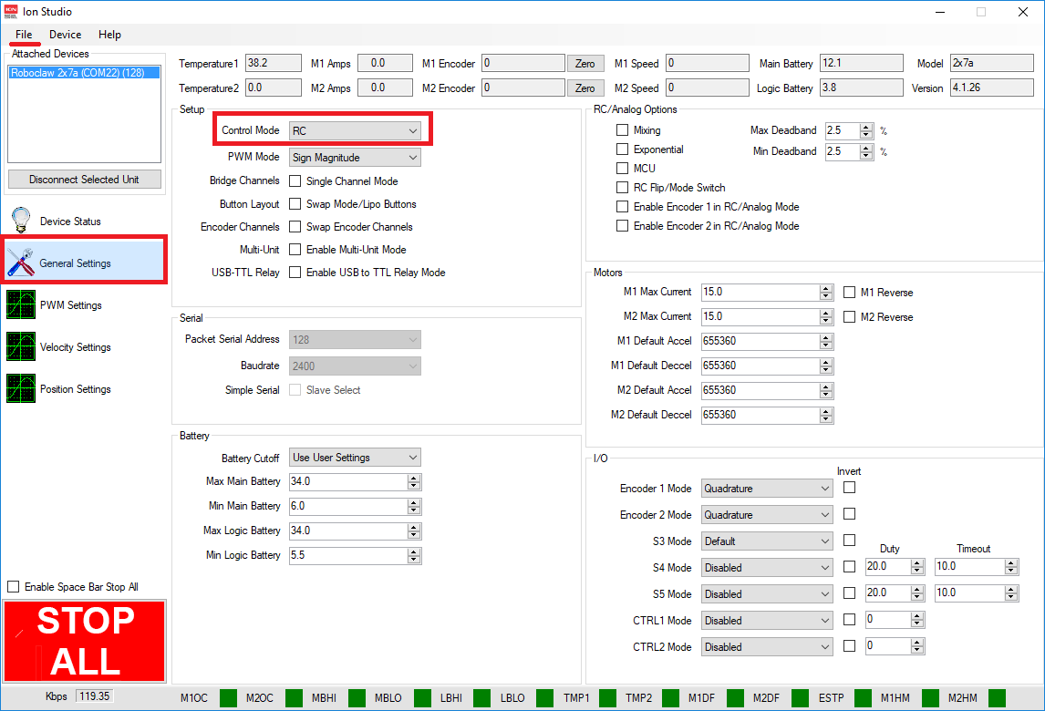 Connect with ION Studio then on the General Settings page, set Control Mode = RC