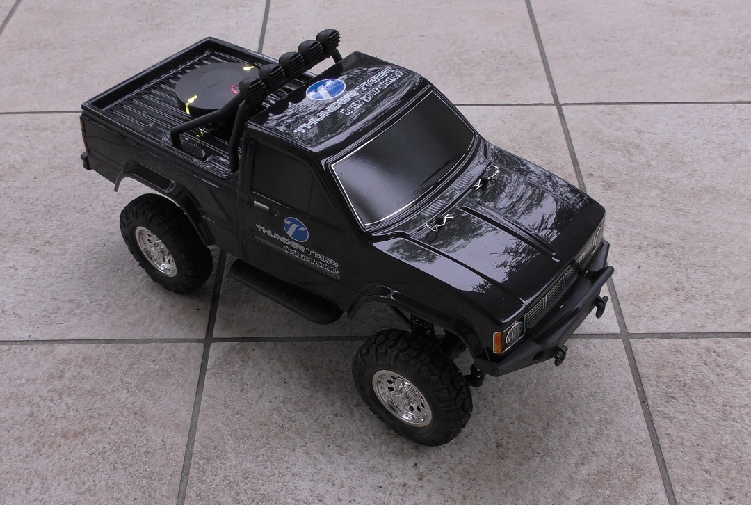 The Thunder Tiger Toyota Hilux is a relatively inexpensive four wheel drive RC car with a top speed of about 1m/s.