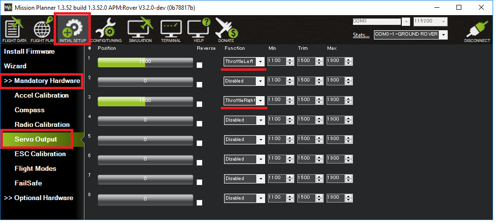 SERVOx_REVERSEDvalue and try again.if a “command rejected” message appears or the motors or steering do not respond to the test, the cause may be written in the Mission Planner’s Flight Data >> Messages tab (see bottom left of the window). Common causes include the radio calibration having not been performed or the