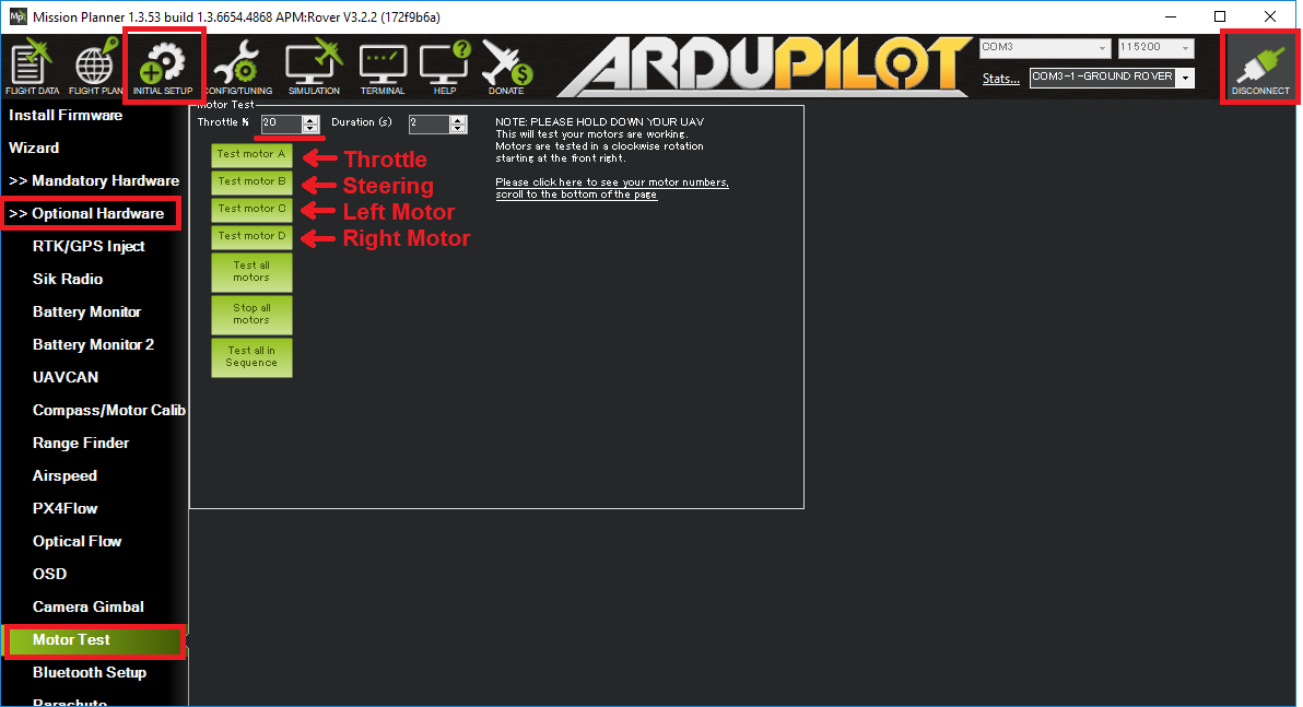 for rovers with separate steering and throttle, pushing the “Test motor A” button should cause the wheels to turn forward, “Test motor B” should cause steering to turn right.