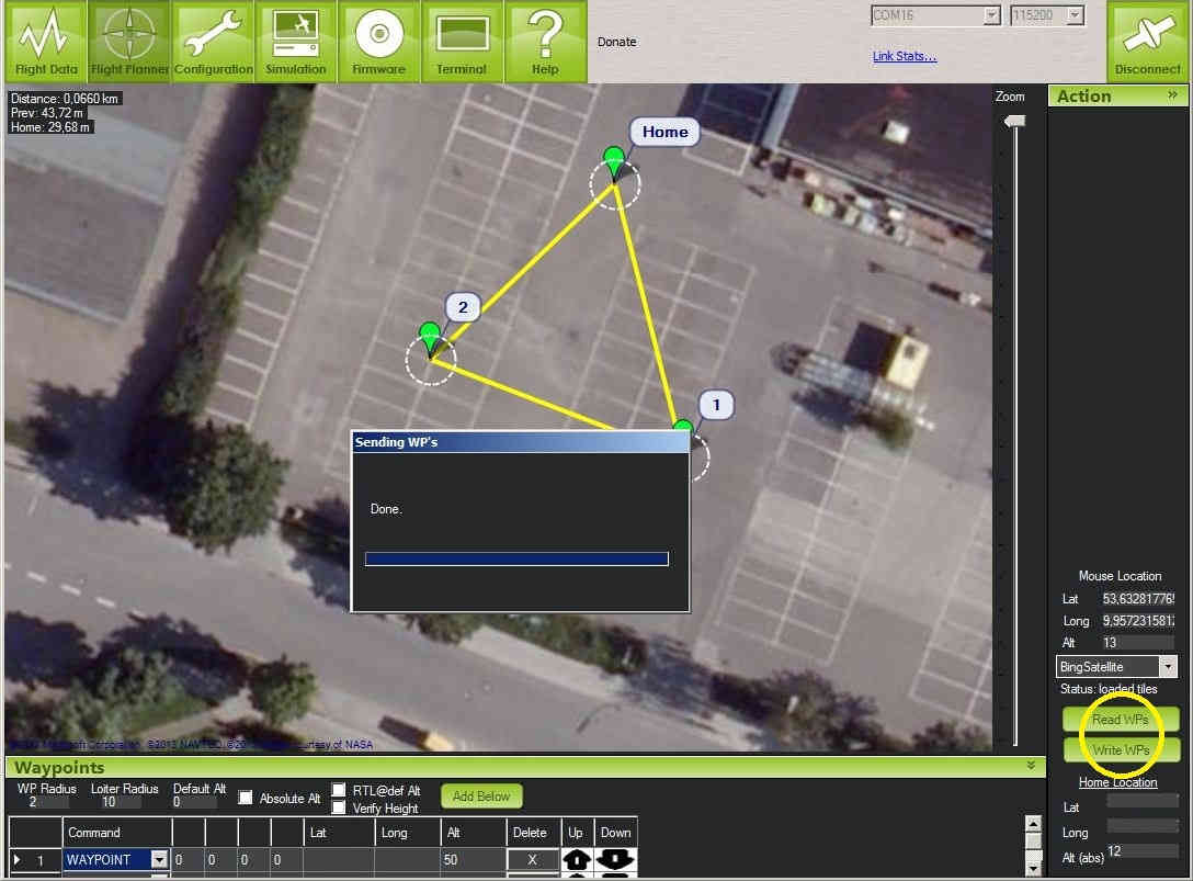 Once the functionality of the Manual and Auto modes has been verified, use the Flight Planner Tab in the MP to setup a waypoint course. Make sure to set the Waypoint Radius to around 2 meters for good performance.
