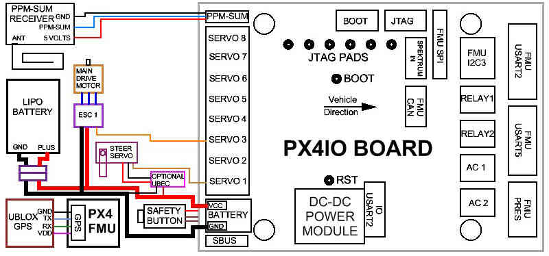 This article provides high level information about how to wire up the PX4FMU/PX4IO autopilot board for Rover and connect its most important peripherals.