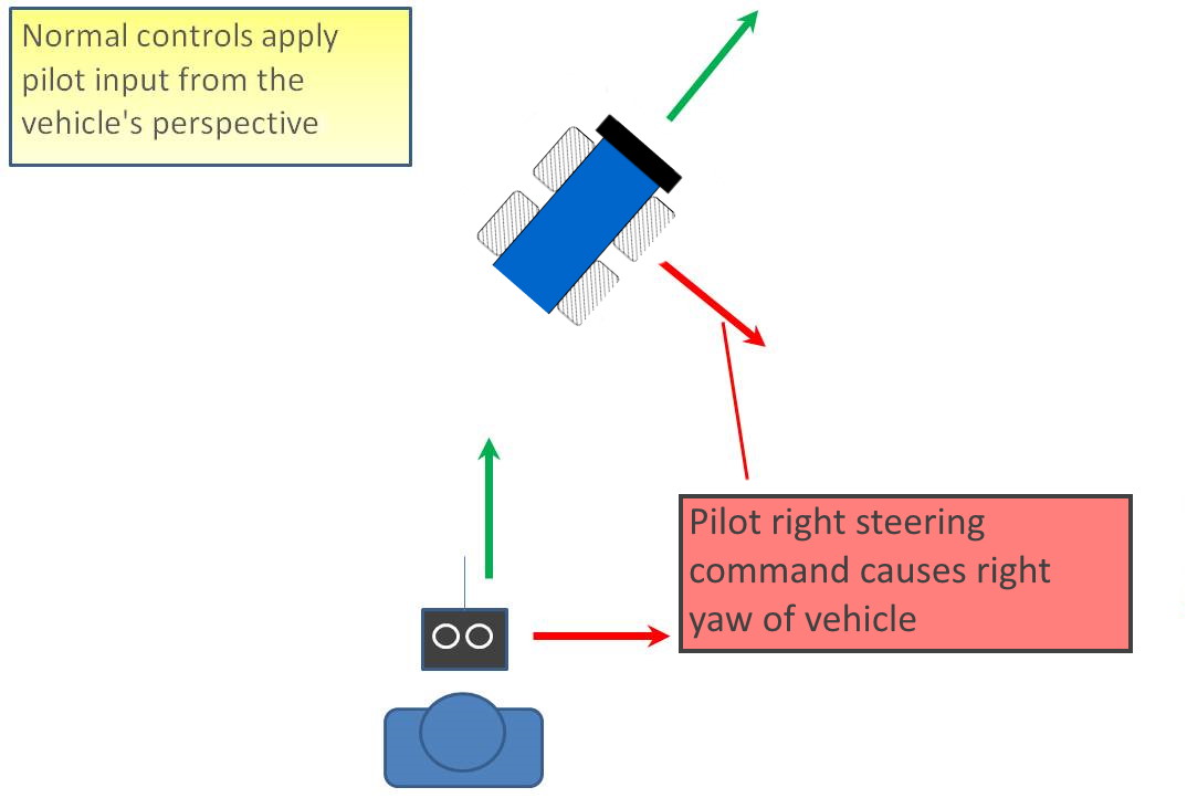 In Manual or Acro modes, the pilot’s transmitter stick inputs are applied in the orientation of the vehicle. For example, in the diagram above when the pilot applies yaw right (red) the vehicle yaws to its right as long as the stick input is not released.