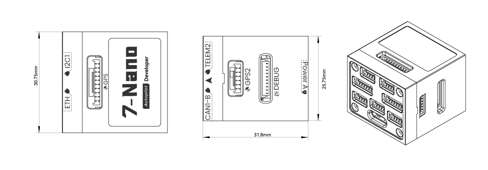The CUAV-7-Nano flight controller produced by CUAV. It has an ultra-small size and a 100M Ethernet interface. Supports 3.3V/5V PWM output.