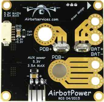 The AirbotPower Power Module (and AirbotPDB stackable companion power distribution board) provides a reliable and simple way to power an autopilot and other UAV components.
