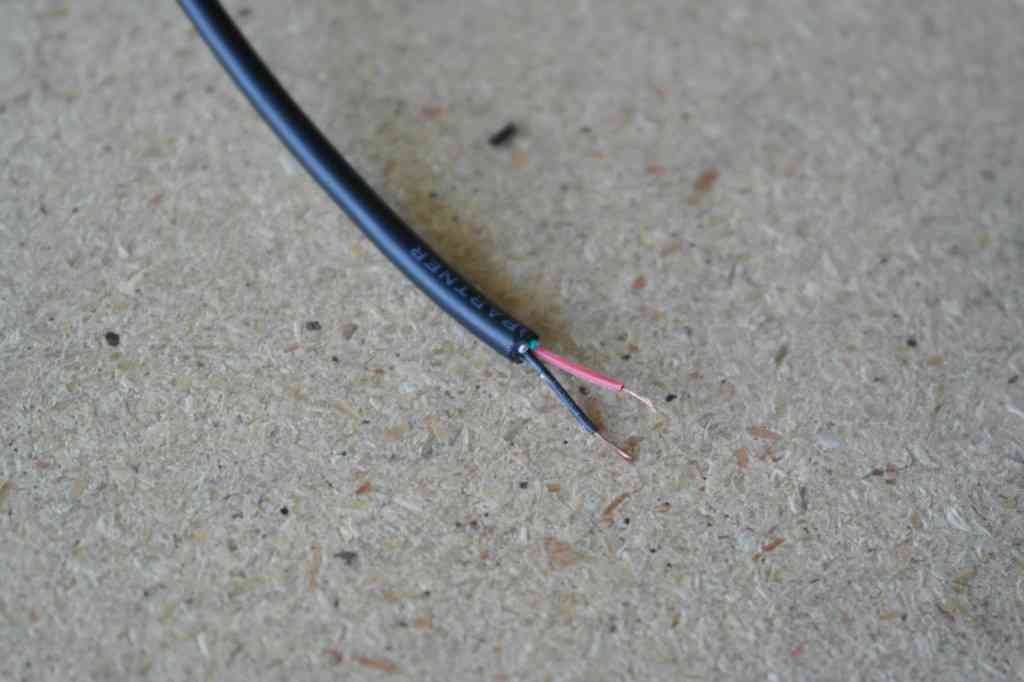 We’ll only be using the Mini-B side of this cable, so measure whatever length you need from that end depending on how your camera and autopilot mount in your airframe. I’ve measured out about 14″ and cut the cable completely through. Inside are four wires, we only need the red and black wire so cut away the green and white wires. Strip the ends of the red and black wires.