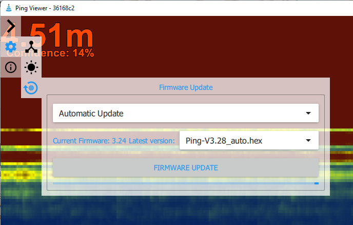 From the upper left menu, select the gear icon, Firmware Upgrade and if necessary upgrade the firmware to “Ping_V3.28_auto” (or higher), or install a custom firmware binary