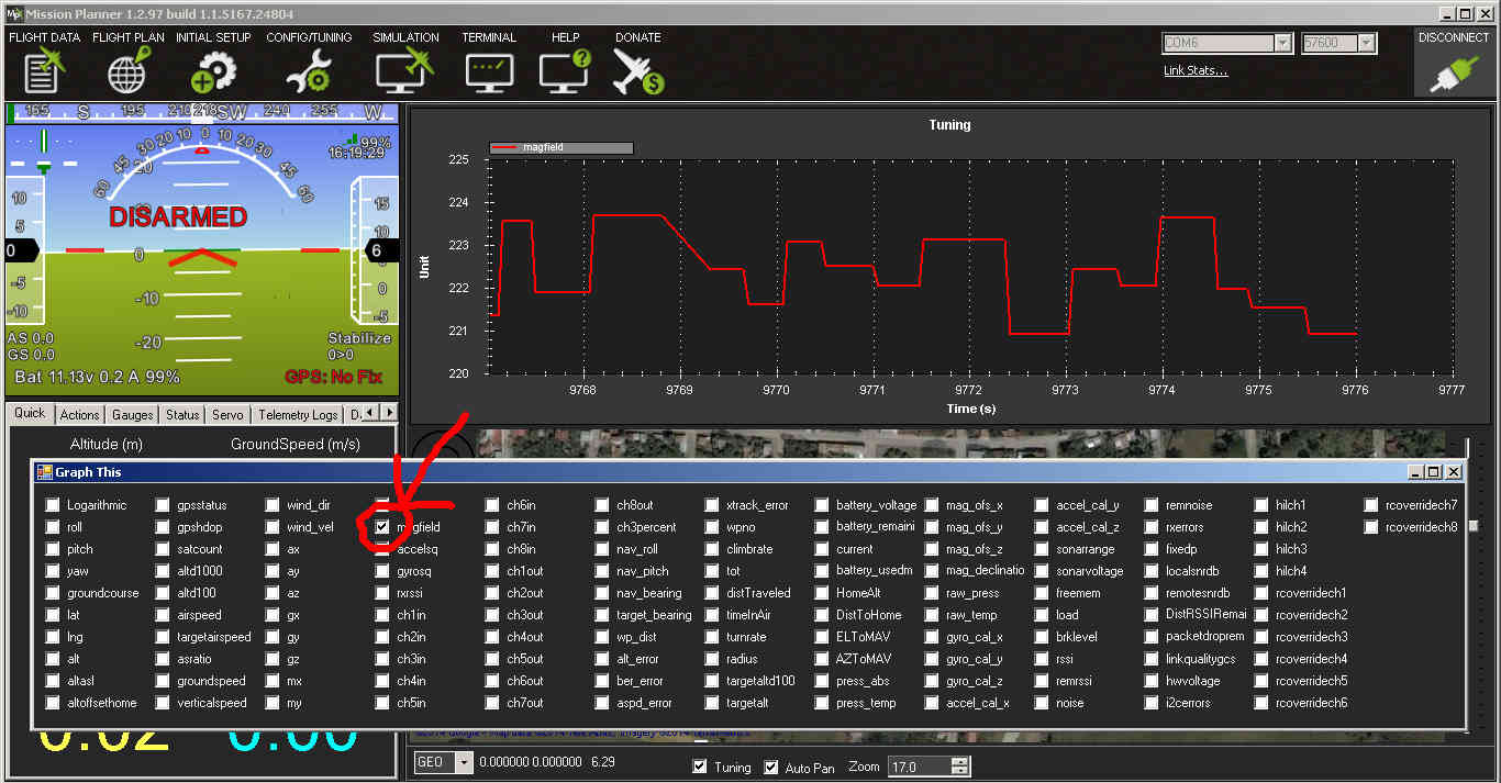 The EPM’s impact on the compass can be tested in real-time by connecting with the Mission Planner. Go to the Flight Data screen and click on the “Tuning” checkbox at the bottom, middle. Double click on the graph that appears on the top right and when the “Graph This” window appears select “magfield”.