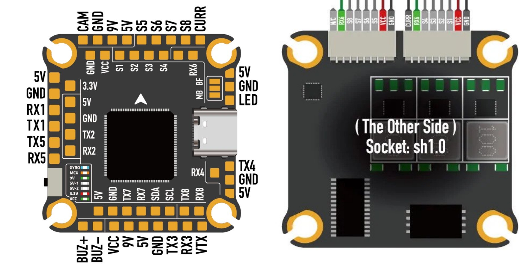 The MambaH743v4 supports up to 9 PWM outputs. The pads for motor output M1 to M8 are provided on both the motor connectors and on separate pads, plus M9 on a separate pad for LED strip or another PWM output.