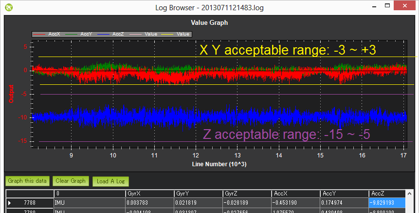 • Check the scale on the left and ensure that your vibration levels for the AccX and AccY are between -3 and +3. For AccZ the acceptable range is -15 to -5. If it is very close or over these limits you should refer back to the Vibration Damping page for possible solutions.