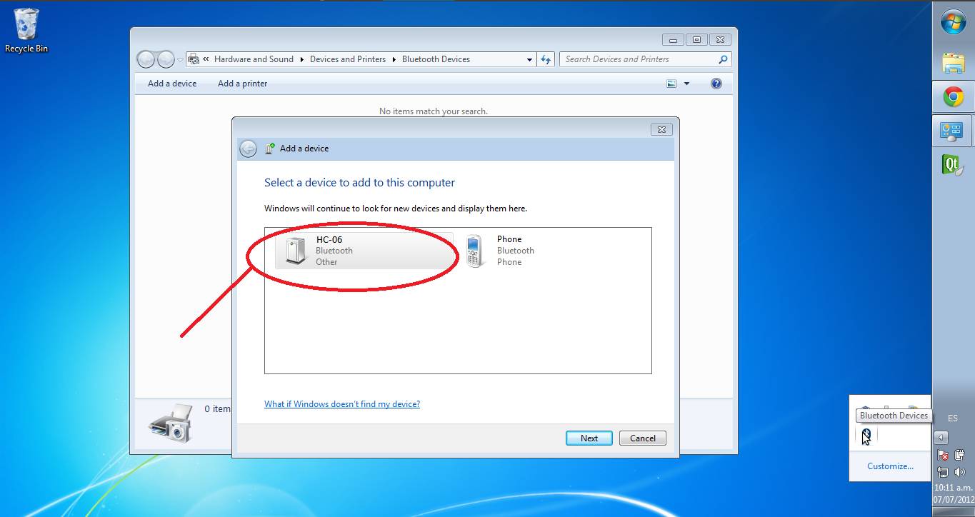 Windows will search for BT devices for you. If you have any BT devices turned on they will show up here (like perhaps your cell phone) ignore any other devices and select the HC-05 or HC-06 (or Linvor) .
