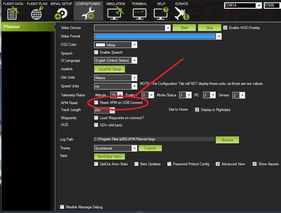 Once again start Mission Planner and go to the Configure/Tuning tab and make sure you UNCHECK the box “Reset on USB connect”