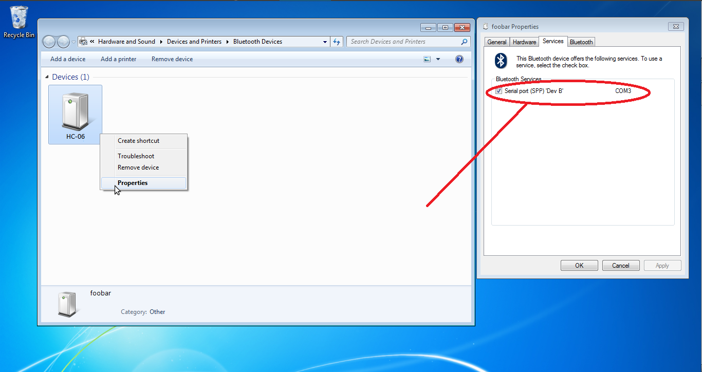 Once paired right click the device and select “properties” The check box for Comm Port SPP should be checked (also note the com port number).