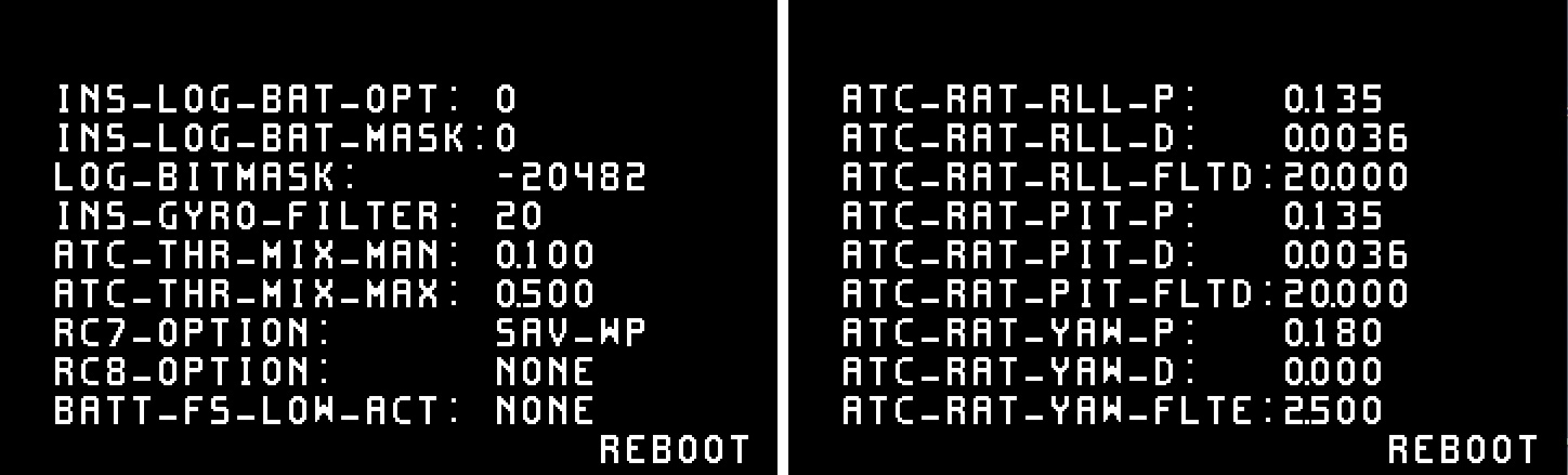This allows to set and adjust parameters using the ArduPilot onboard OSD and an RC transmitter’s stick input. There’s two additional OSD screens available (OSD5 and OSD6), with 9 “slots” each to hold parameters. The screens display a default set of parameters to start with. Additionally, it is possible to change the parameter used in a respective slot directly (on-screen) using stick inputs, or using MAVProxy’s osd-module command-line setup.