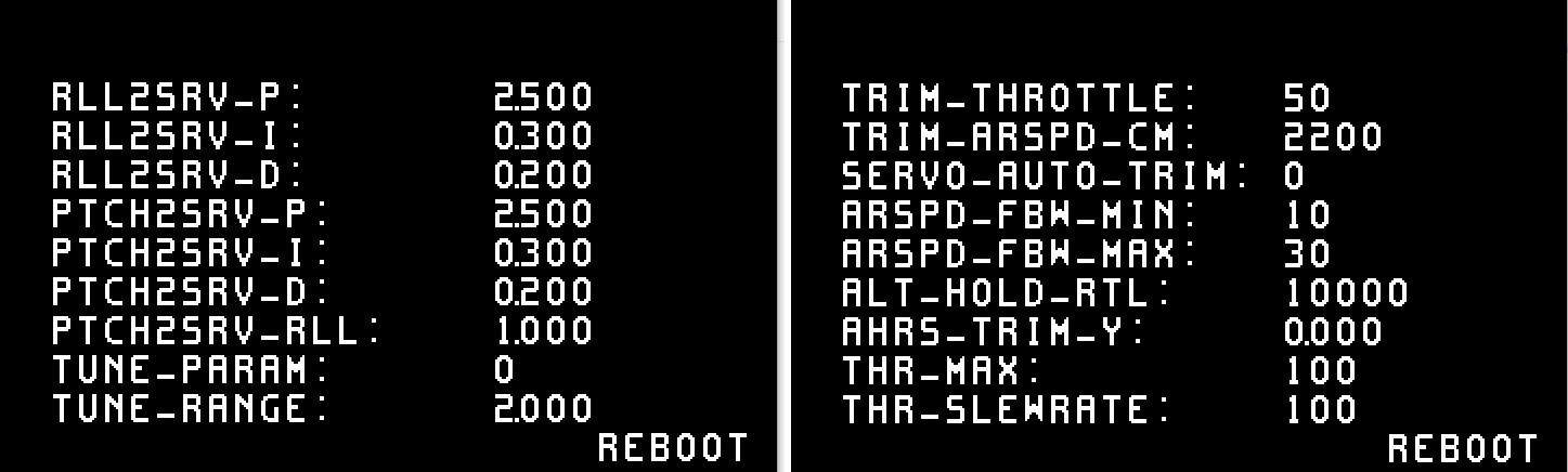 To enable the parameter screens, set OSD5_ENABLE and OSD6_ENABLE = 1. Parameter screens can be accessed in the same way the conventional osd screens are accessed. See the documentation on OSD screens and switching for reference. When one of the parameter screens is selected, adjustments can be made in disarmed state only. If a parameter screen is selected inflight, the screen allows display only. This allows live monitoring of automatic parameter adjustments, i.e. when performing autotune procedures or automatic servo trims.