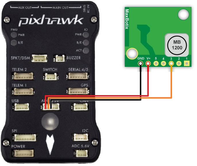 The sonar should be connected to the Pixhawk’s ADC 3.3V port as shown below. The Pixhawk will provide the regulated 5V power supply the sonar requires.