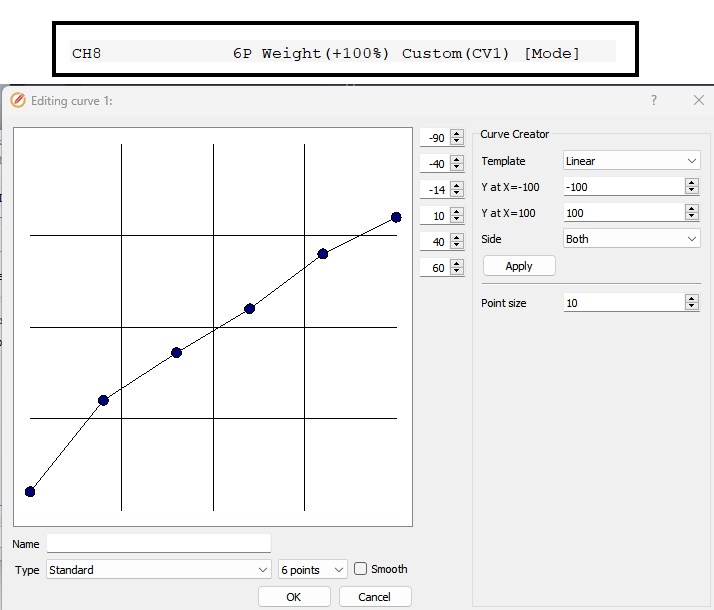 Setup your flight mode channel using “6P’, the six position switch, as its source, but with a weighted curve to move each position to be centered in ArduPilot’s required PWM values for each mode selection as shown below: