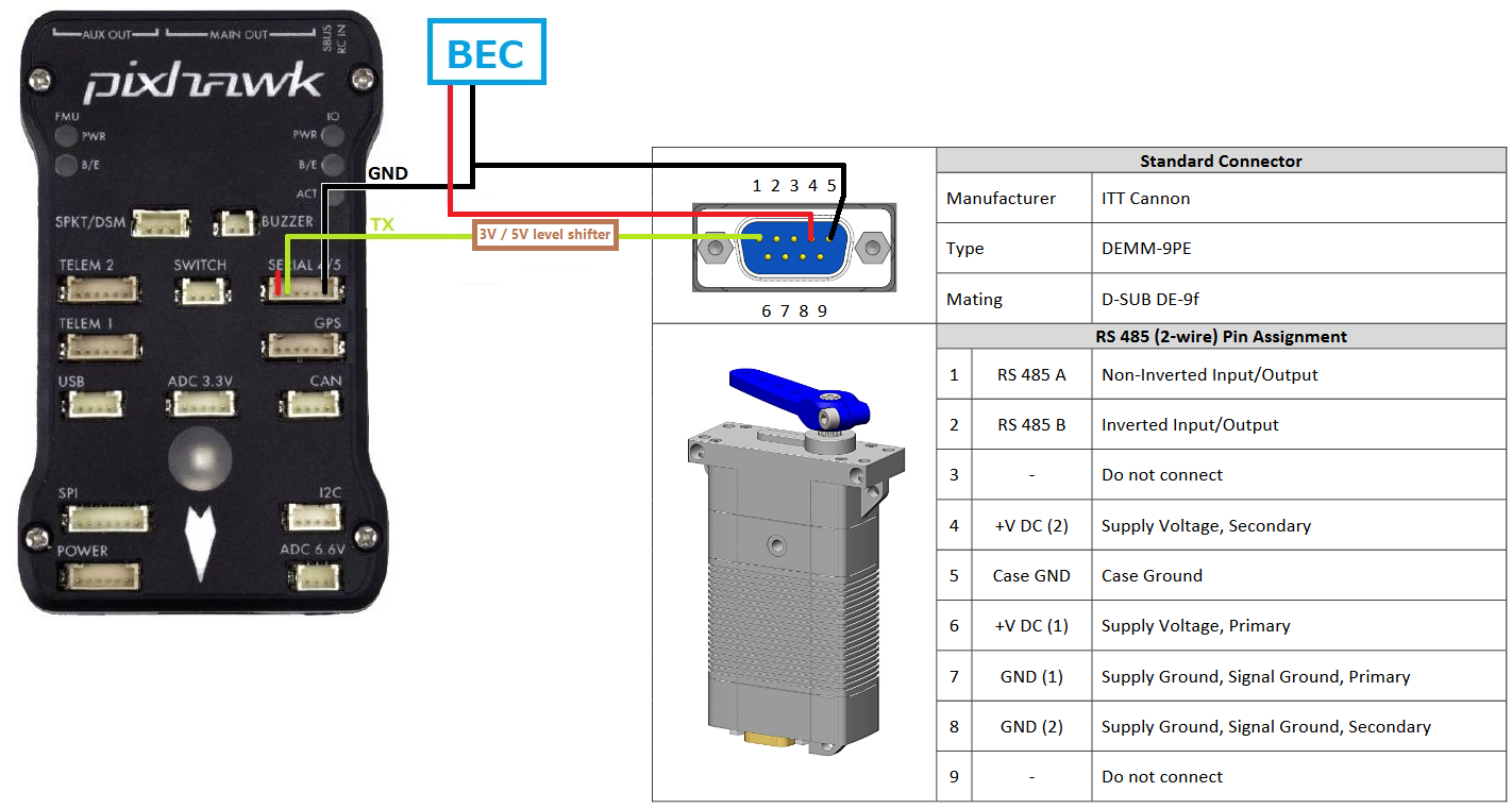 • Connect the servo’s TTL pin to a 5V-to-3V level shifter and then to one of the autopilot’s serial port’s TX pins. The diagram above shows the servo connected to a Pixhawk’s Serial4 port but other serial ports can also be used